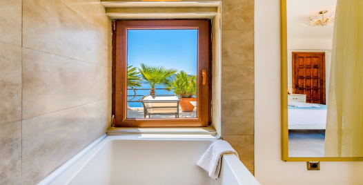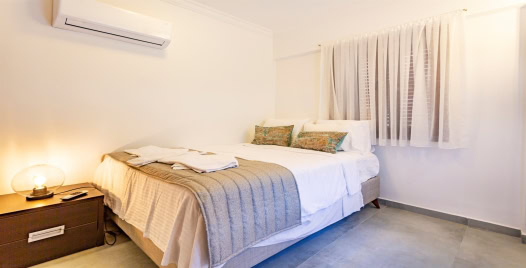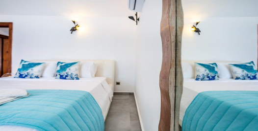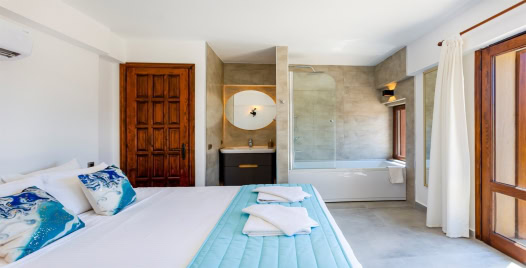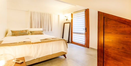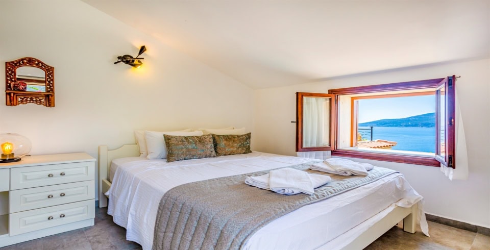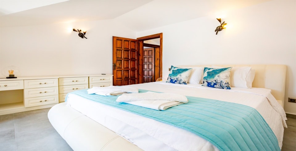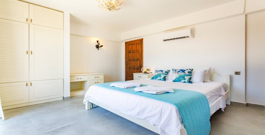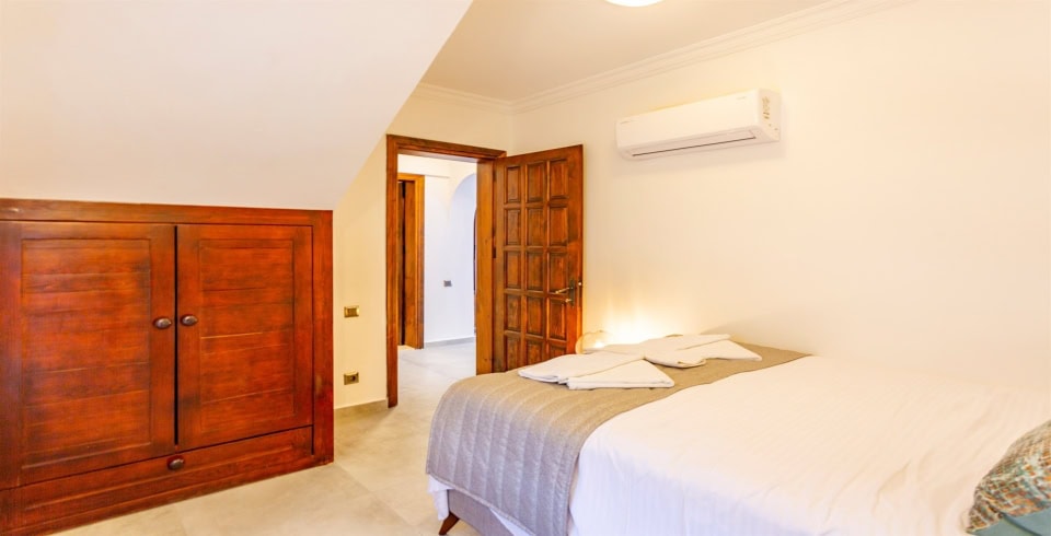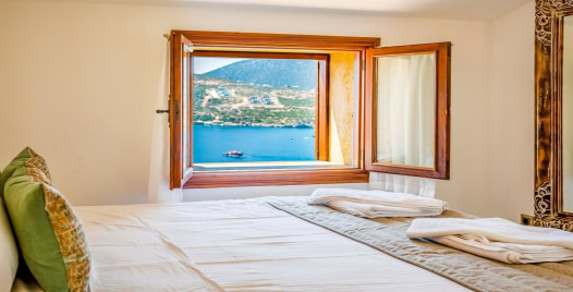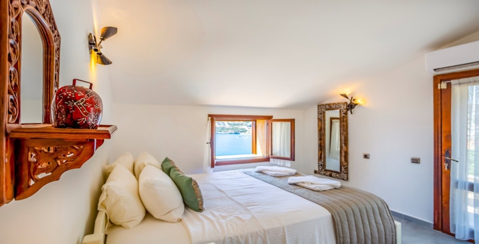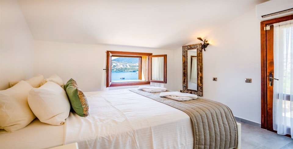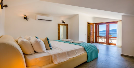 1. Yatak Odası : Çift kişilik yatak, komodin, elbise dolabı, klima, makyaj masası, banyo ve tuvalet bulunmaktadır. Deniz manzaralıdır.