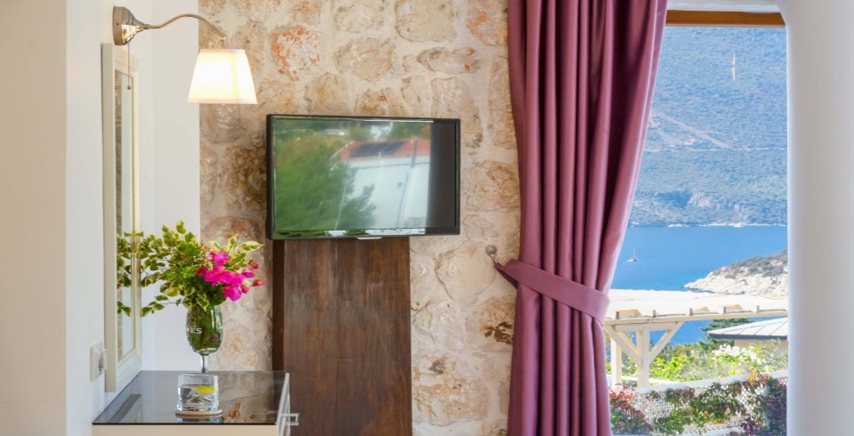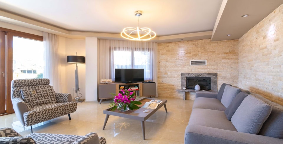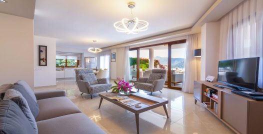 Salon : Salonda bulunan lüks ve konforlu oturma grubu, TV, klima gibi rahatınıza eşlik edecek eşyalar ile manzaranın keyfini salondan çıkarabilirsiniz.
