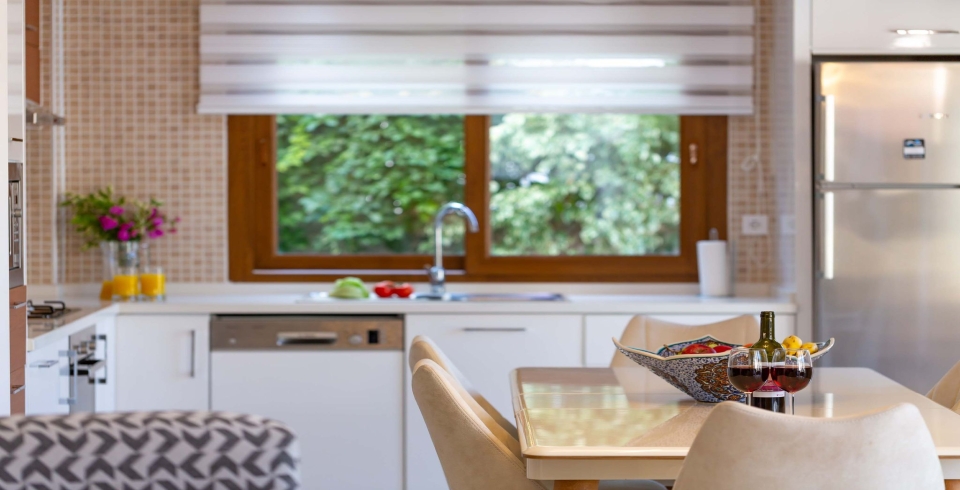 Mutfak : Eksiksiz ve modern bir şekilde dekore edilmiş Amerikan mutfağımızın içerisinde yer alan buzdolabı, fırın, su ısıtıcısı, çatal, bıçak gibi mutfak eşyaları sayesinde kolayca yemeklerinizi hazırlayabilirsiniz.