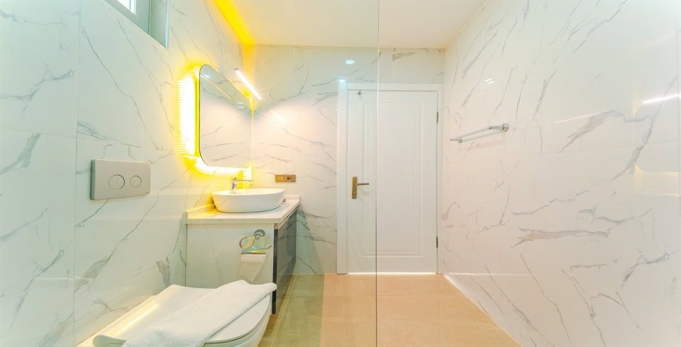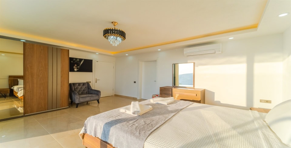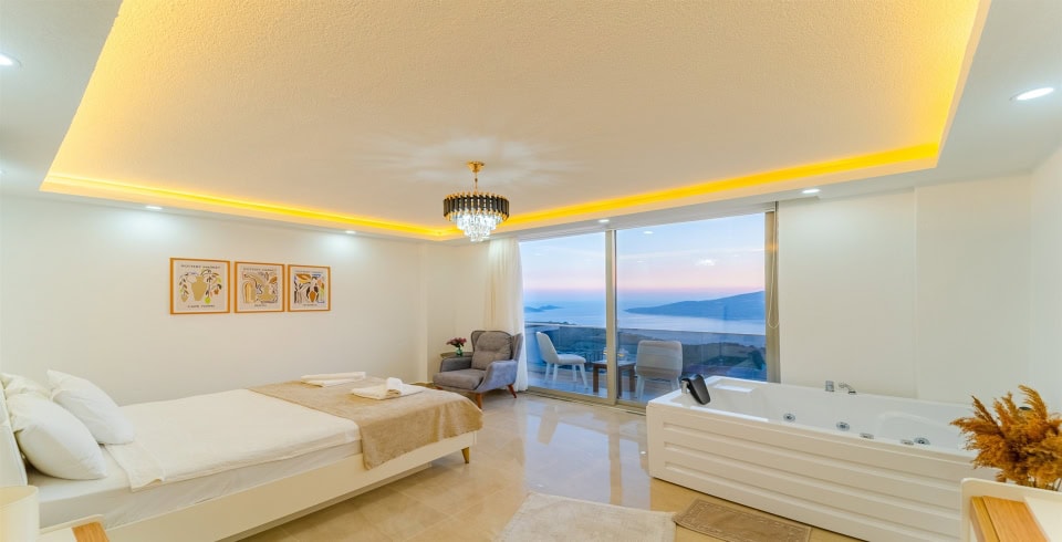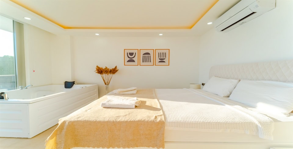 4. Yatak Odası : Süit çift kişilik aile yatak odası, Komodin, Klima, Makyaj masası, elbise dolabı, Jakuzi, banyo ve Lavabo bulunmaktadır.
