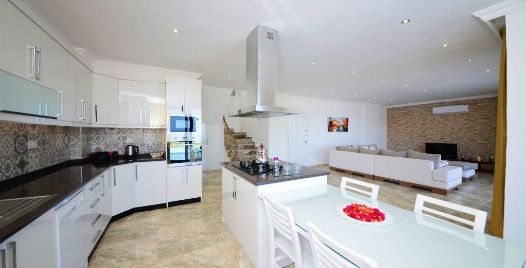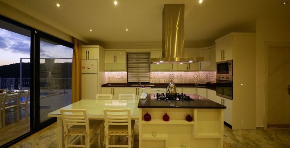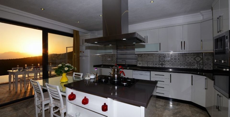 Mutfak : Villamızın geniş Amerikan mutfağı ile sizlere kendi evinizin mutfağı gibi hissettirecek. Ayrıca mutfakta klima, bulaşık makinası, buzdolabı, çamaşır makinası, mikrodalga fırın, tost makinası, ekmek kızartma, su ısıtıcısı, fırın, 4`lü ocak seti ve 4 kişilik geniş yemek masası ile tava tencere vb. mutfak araç gereçlerini kullanma fırsatını sizlere sunuyoruz.
