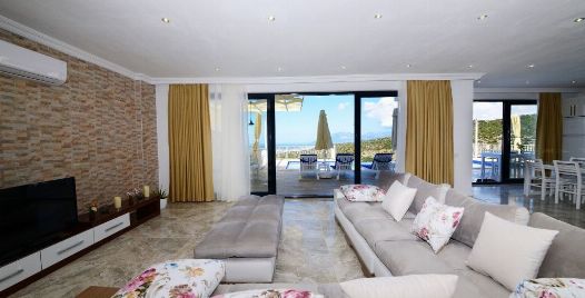 Salon : Villa Kaan’ın salonunda sizi şık bir oturma grubu ile klima, televizyon, internet, uydu, koltuk, sehpa ile ferah bir salon bekliyor olacaktır. Havuz terasına çıkış yapılmaktadır.