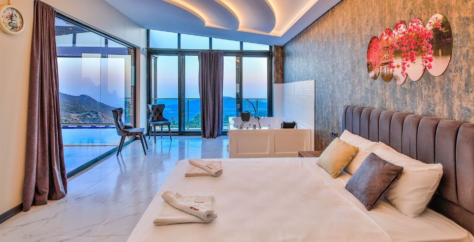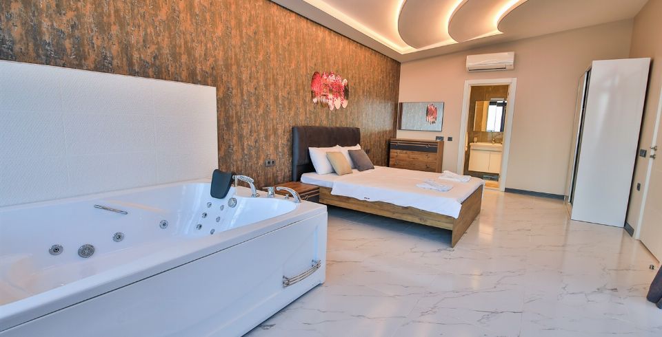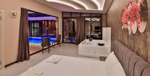 1. Yatak Odası : Doğa ile iç içe olan villamızın yatak odası manzarasında da sizi sonsuz güzel yeşillikler karşılayacak. Eşsiz doğa manzarasına karşı bir de jakuzi ve ayrı özel yüzme havuzu odası bulunmaktadır. Beraberinde çift kişilik yatak, klima, komodin, makyaj masası, banyo ve lavabo bulunmaktadır.