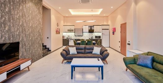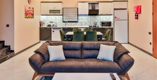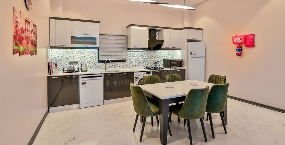 Mutfak : Modern Amerika mutfağımızda 8 kişilik yemek masası, buzdolabı, çamaşır makinesi, mikrodalga fırın, 4’lü ocak, tost makinesi, elektrikli su ısıtıcısı, çatal-bıçak takımı, tencere-tava takımı, bulaşık makinesi bulunmaktadır.