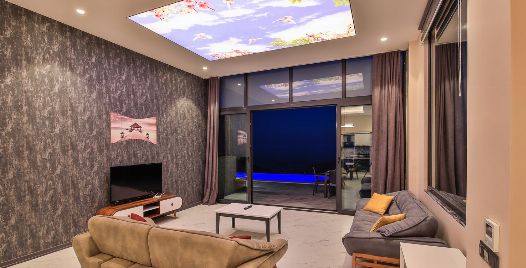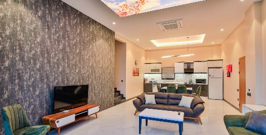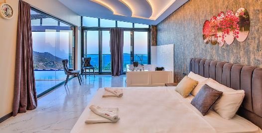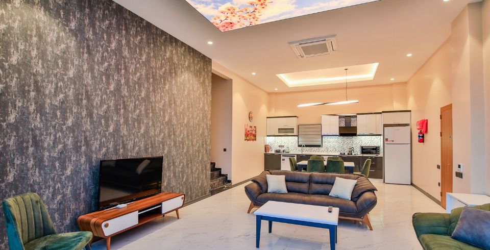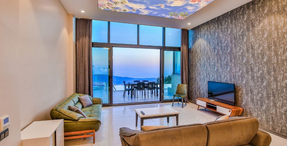 Salon : Muhteşem deniz manzaralı, havuz terasına direkt çıkışı bulunan salonumuzda oturma grubu, televizyon, DVD, TV ünitesi ve ses sistemi bulunmaktadır.