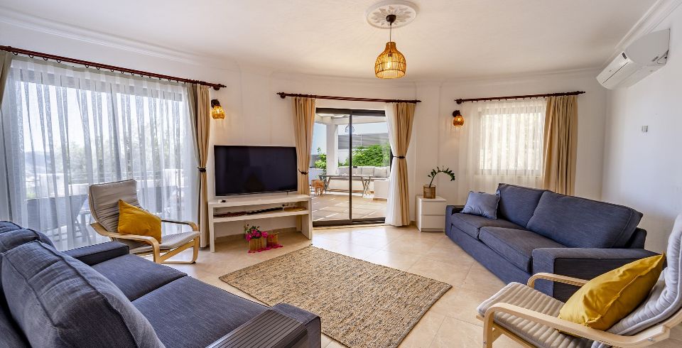 Salon : Salon içerisinde oturma grubu, TV, klima, sehpa bulunmaktadır. Havuz terasına çıkış yapılabilmektedir.