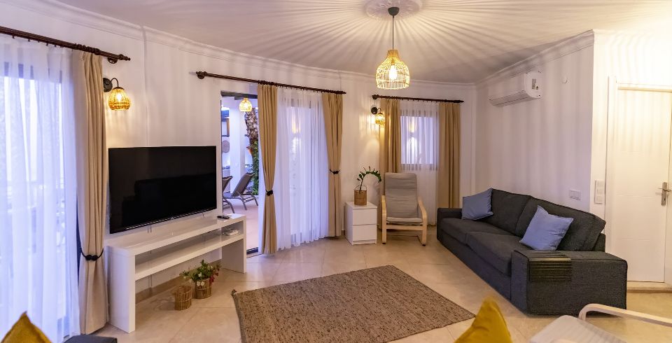 Salon : Salon içerisinde oturma grubu, TV, klima, sehpa bulunmaktadır. Havuz terasına çıkış yapılabilmektedir.