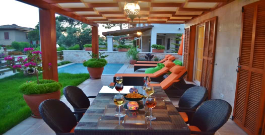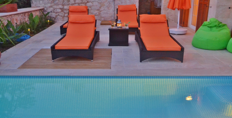 Havuz Bahçe: Villa KaLu geniş bir bahçeye sahiptir. Villamızın havuz terası gayet geniş olup Özel yüzme havuzu, barbekü mangal, dış duş, şezlong, yemek masası, şemsiye ve pergole yer almaktadır.