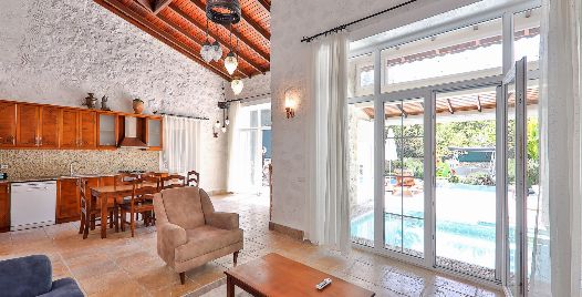 Salon : Villa Kaputaş 5’in salonunda sizi şık bir oturma grubu ile klima, televizyon, internet, uydu, koltuk, sehpa ile ferah bir salon bekliyor olacaktır. Havuz terasına çıkış yapılmaktadır.