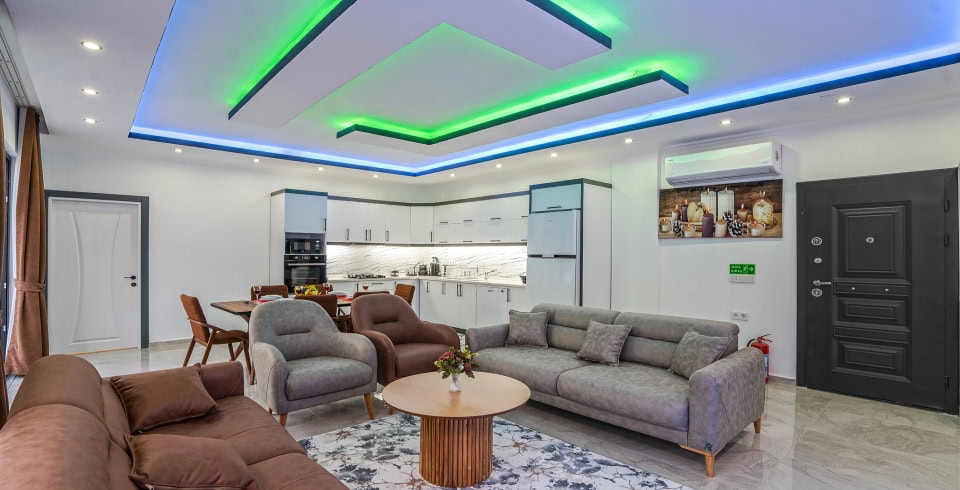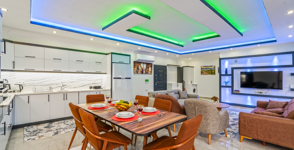 Salon: Amerikan mutfak olarak dizayn edilmiştir, oturma grubu, TV, yemek masası bulunmaktadır.