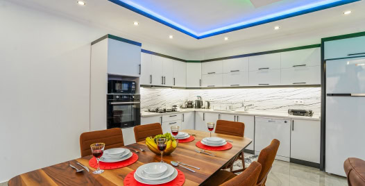 Mutfak: Modern Amerikan mutfakta ; buzdolabı, bulaşık makinesi, çamaşır makinesi, ankastre fırın, mikrodalga fırın, 4'lü ocak, tencereler, tavalar, bardaklar, elektrikli su ısıtıcısı, yemek takımı, çatal - kaşık takımı, yemek masası ve sandalyeler bulunmaktadır.