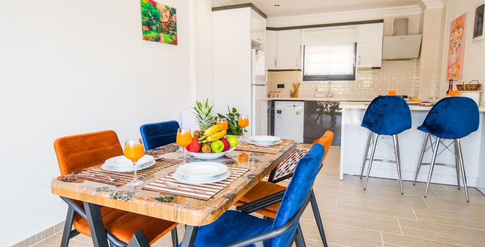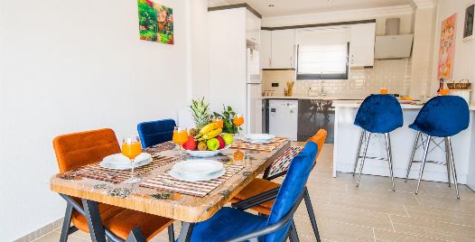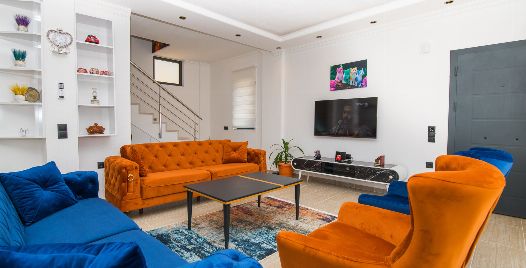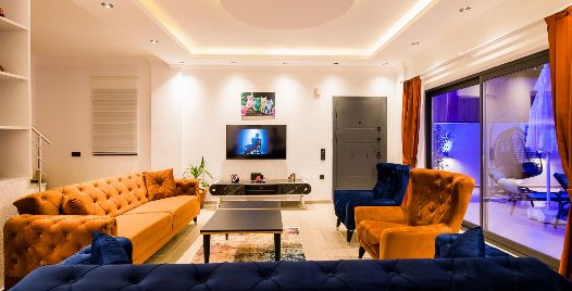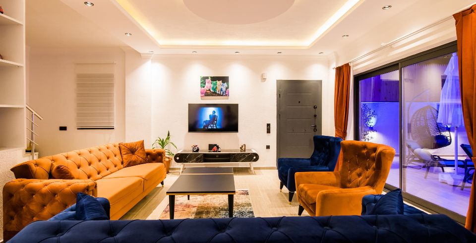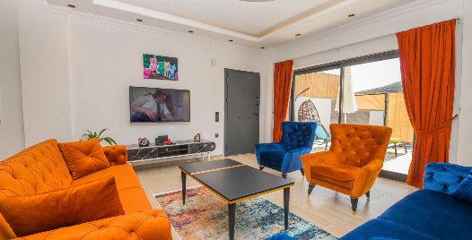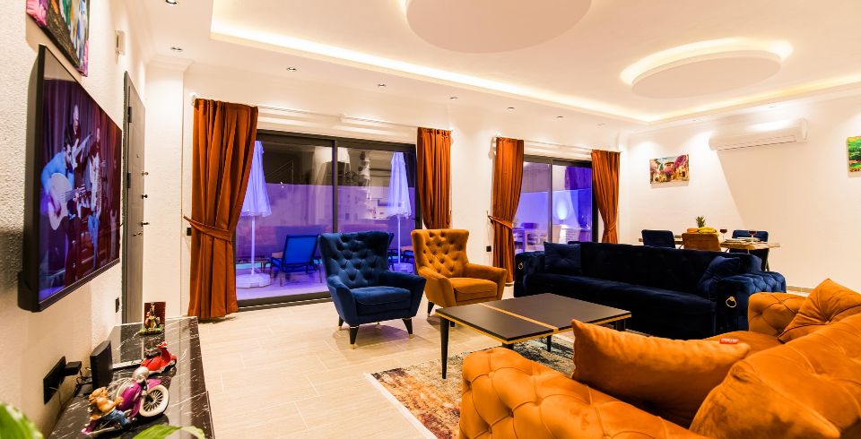 Salon: Villa salonunda konforlu oturma grubu, klima, TV, langırt, internet, uydu alıcı, yemek masası, sehpa bulunmaktadır.