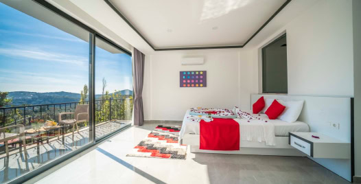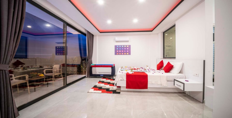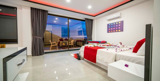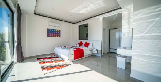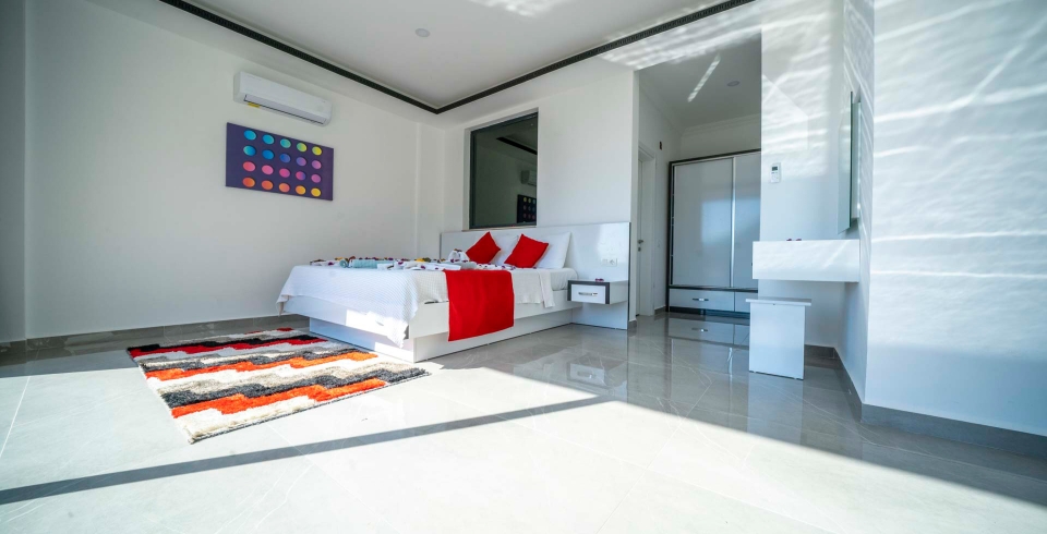 1. Yatak odasi: En süit odada çift kisilik yatak, makyaj masasi, klima, elbise dolabi, komodin, jakuzi, tuvalet, banyo ve balkon bulunmaktadir.