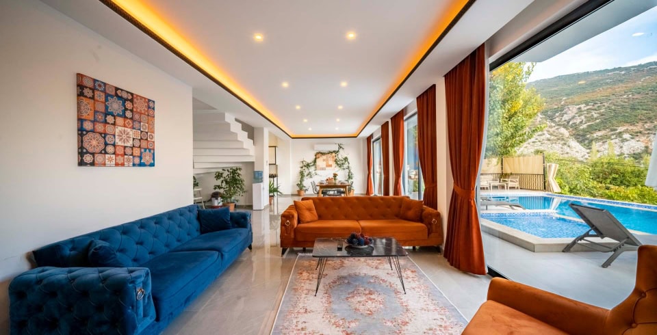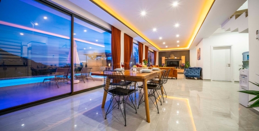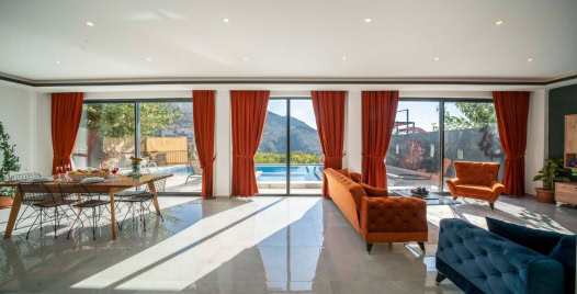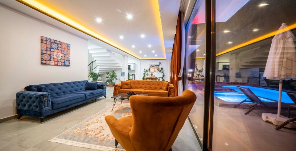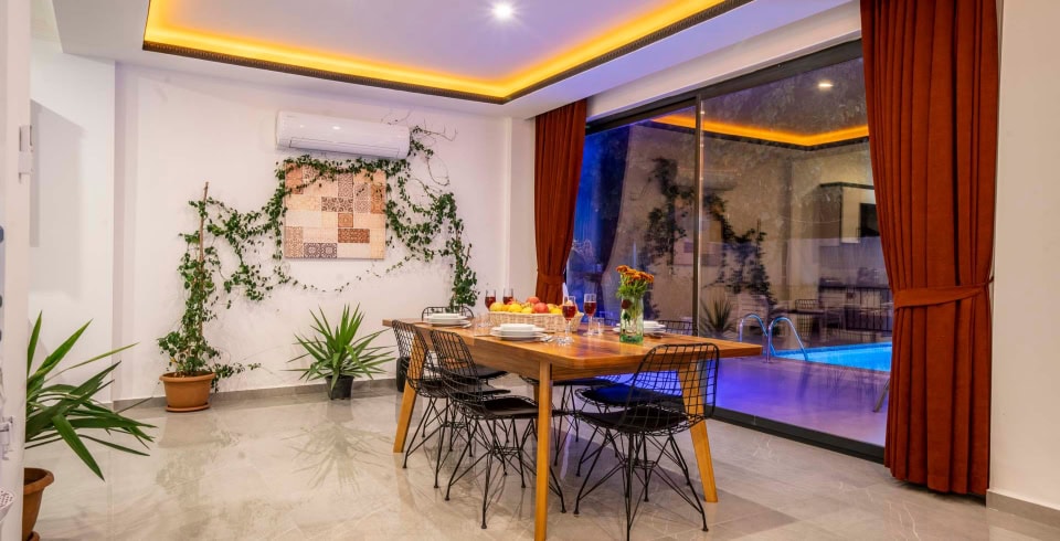 Salon : Oturma Grubu, sehpa, uydu, TV (LCD), Internet, Klima, 6 Kisilik Yemek Masasi, su sebili, Havuz Terasina Çikis