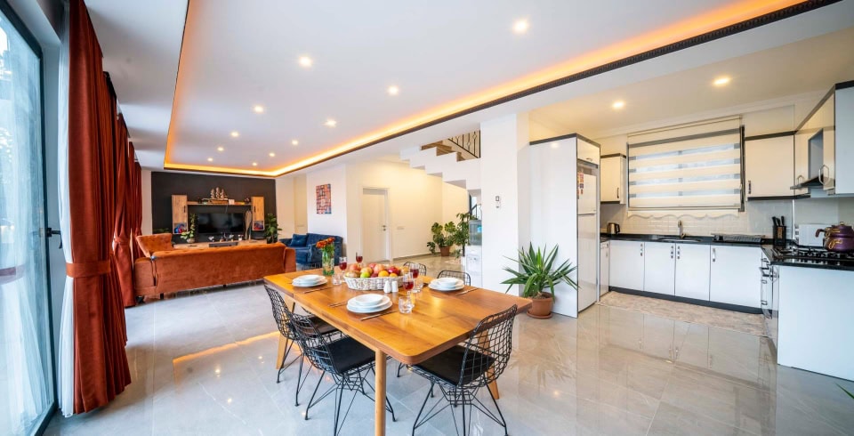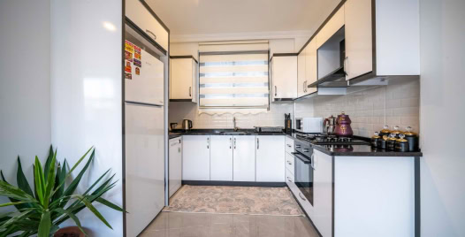 Mutfak: Modern Dizayn Edilmis Amerikan Mutfak, Buzdolabi, Bulasik Makinesi, Çamasir Makinesi, Firin, 4’lü Ocak (ankastre), Mikrodalga Firin, Elektrikli Su Isitici(kettle), Tost Makinesi, Tava & Tencere vb. Mutfak Ekipmanlari, 4 Kisilik Yemek Takimi