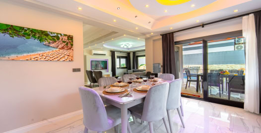 Salon: Özenle döşenmiş salon, modern koltuklar, 6 kişilik yemek masası, LCD TV ve klima bulunmaktadır.