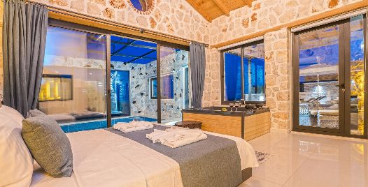 1. Yatak Odası: Çift kişilik yatak, klima, jakuzi, komodin, elbise dolabı, makyaj masası, banyo ve tuvalet bulunmaktadır.