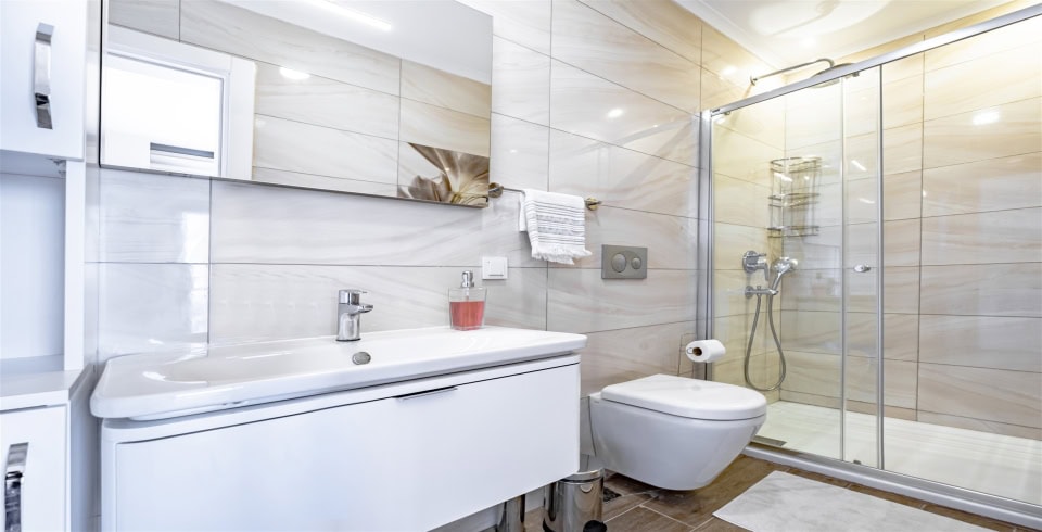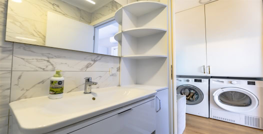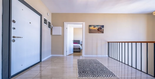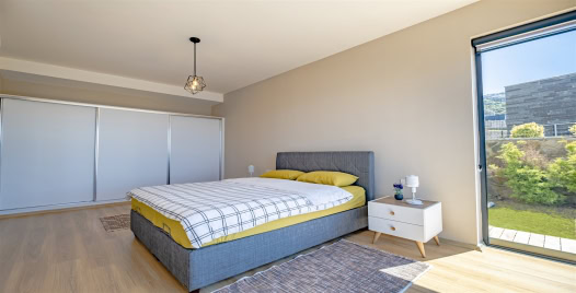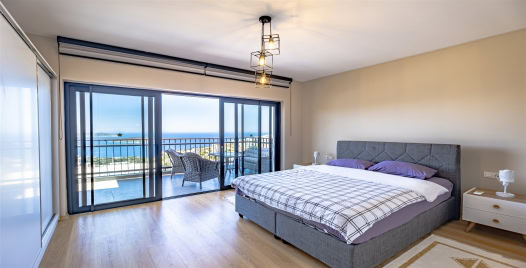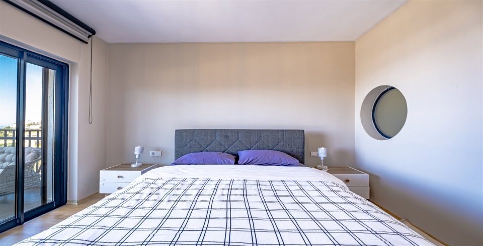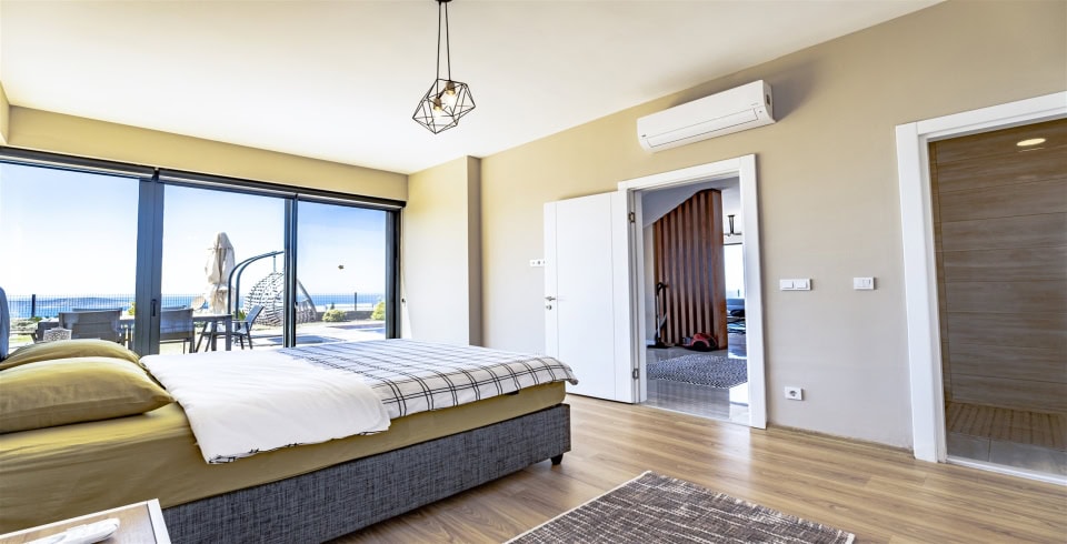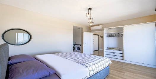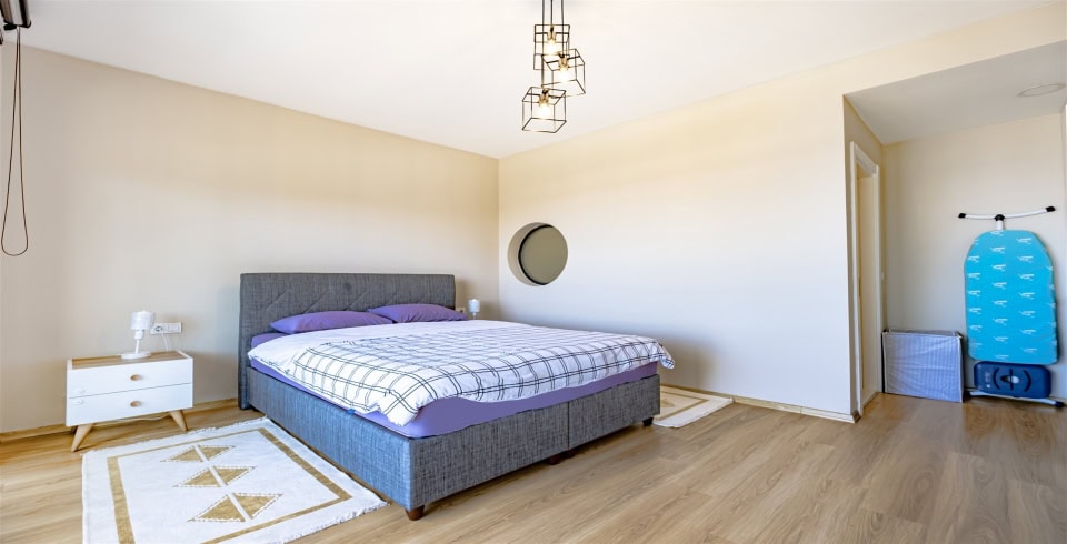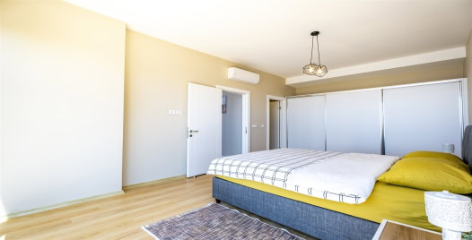 1. Yatak Odası: 1 adet çift kişilik yatak, odaya özel banyo, klima, çamaşır ve kurutma makinesi.
