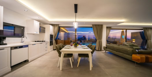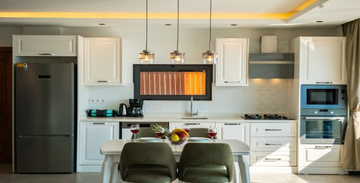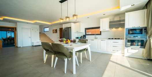 Mutfak : Villamızın geniş Amerikan mutfağı ile sizlere kendi evinizin mutfağı gibi hissettirecek. Ayrıca mutfakta klima, bulaşık makinası, buzdolabı, çamaşır makinası, mikrodalga fırın, tost makinası, ekmek kızartma, su ısıtıcısı, fırın, 4`lü ocak seti ve 6 kişilik geniş yemek masası ile tava tencere vb. mutfak araç gereçlerini kullanma fırsatını sizlere sunuyoruz.