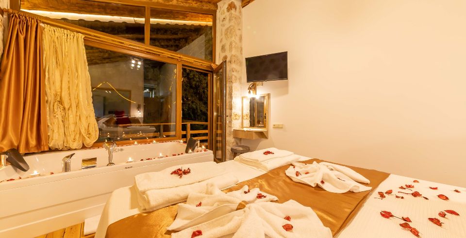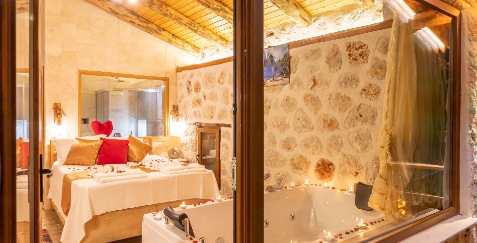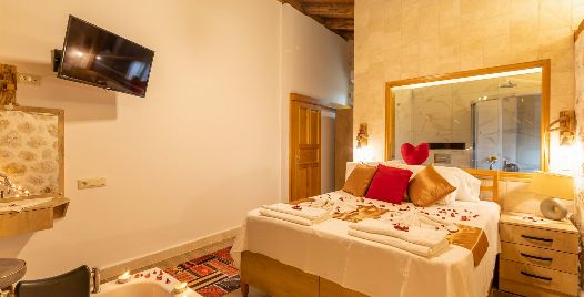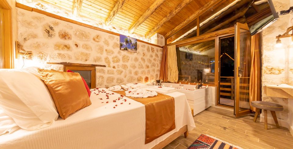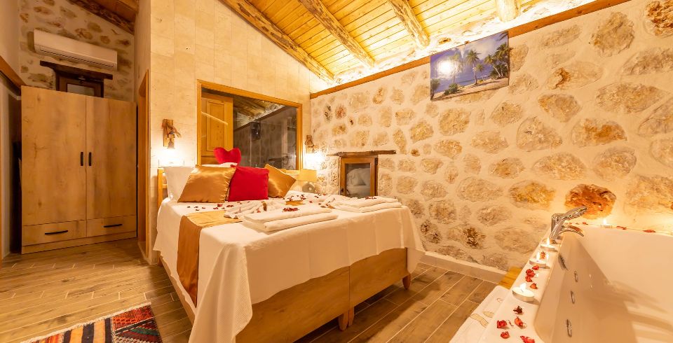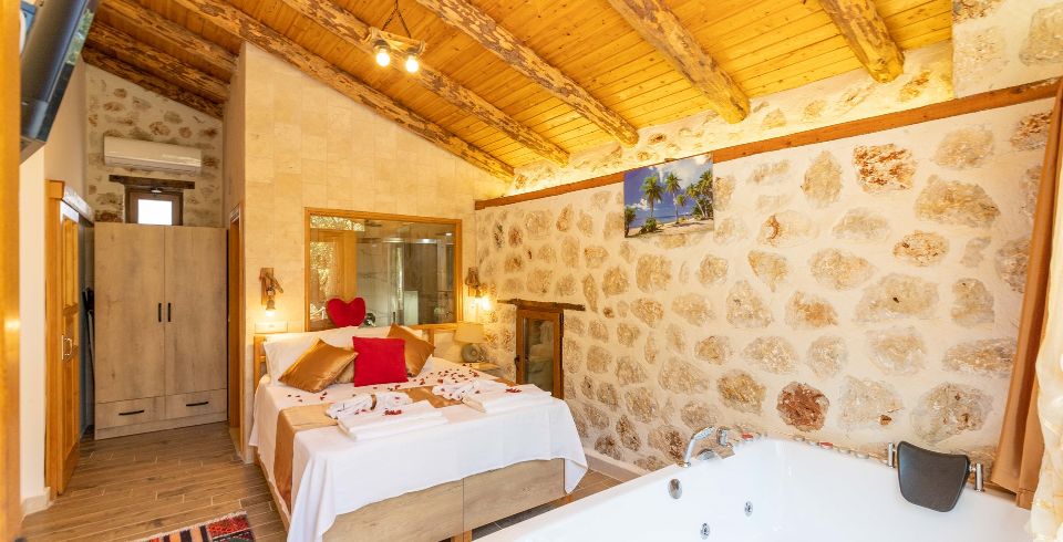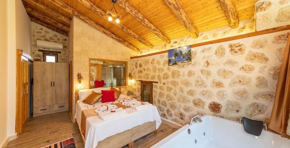1. Yatak Odası: Çift kişilik yatak, klima, jakuzi, komodin, elbise dolabı, makyaj masası, banyo ve tuvalet bulunmaktadır.