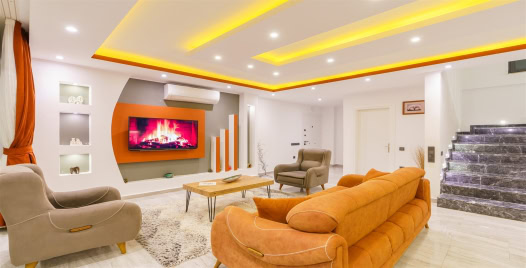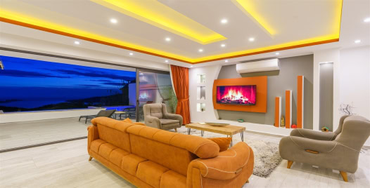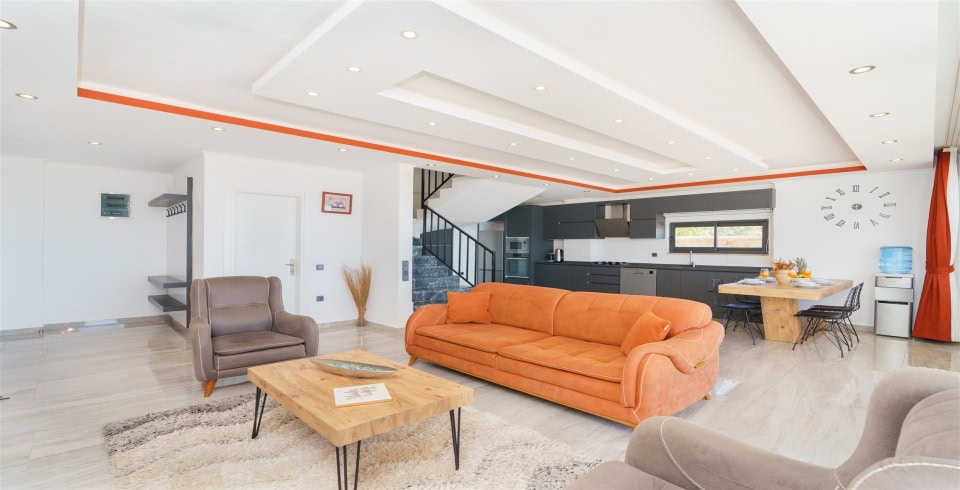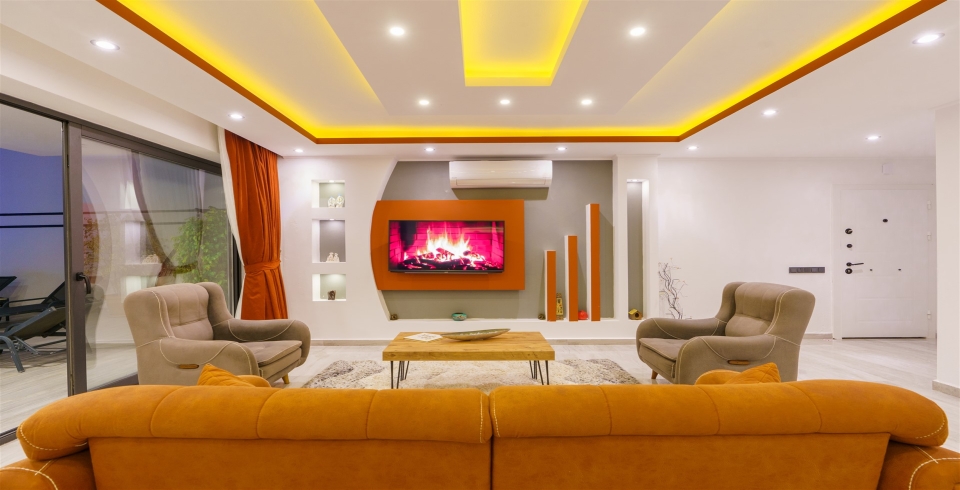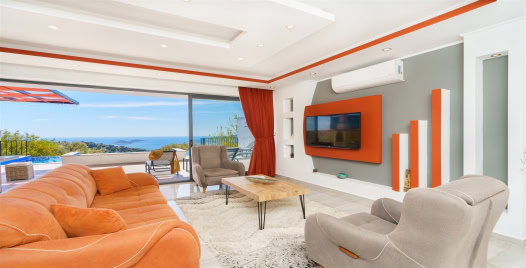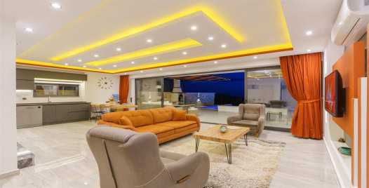 Salon : Salon içerisinde oturma grubu, TV, klima, sehpa bulunmaktadır. Havuz terasına çıkış yapılabilmektedir.