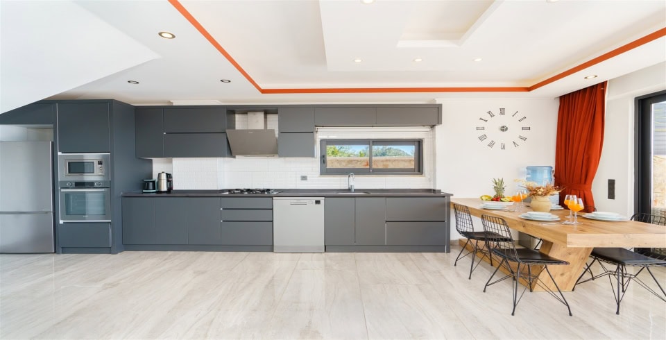 Mutfak : Modern Amerikan mutfak içerisinde buzdolabı, bulaşık makinası, fırın, ocak, mikrodalga fırın, tost makinası, yemek masası, yemek takımları, çatal ve bıçak takımları, tencere ve tava takımları, bardaklar bulunmaktadır.