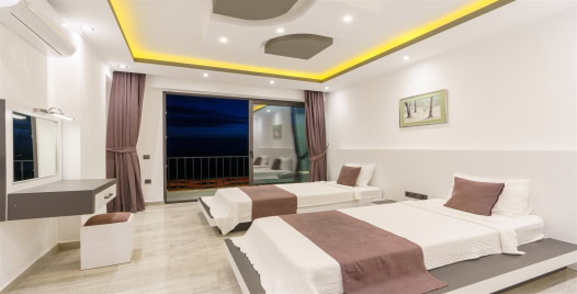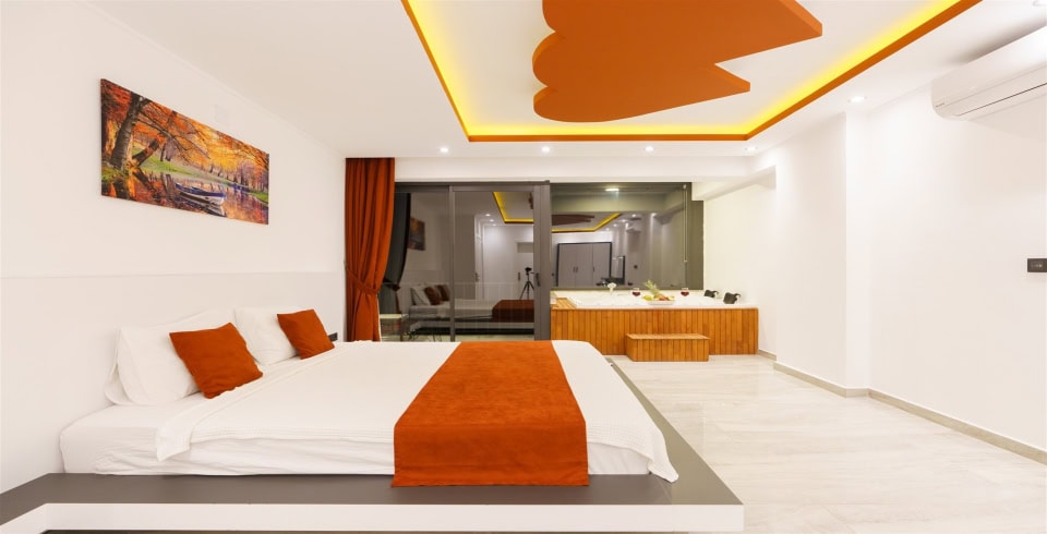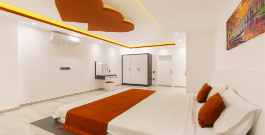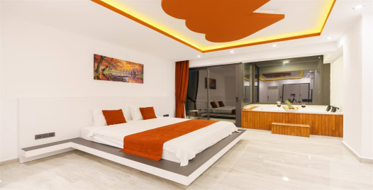 1. Yatak Odası : 1 adet çift kişilik yatak, klima, komodin, elbise dolabı, makyaj masası, jakuzi, balkon, banyo ve tuvalet bulunmaktadır.