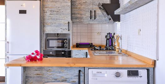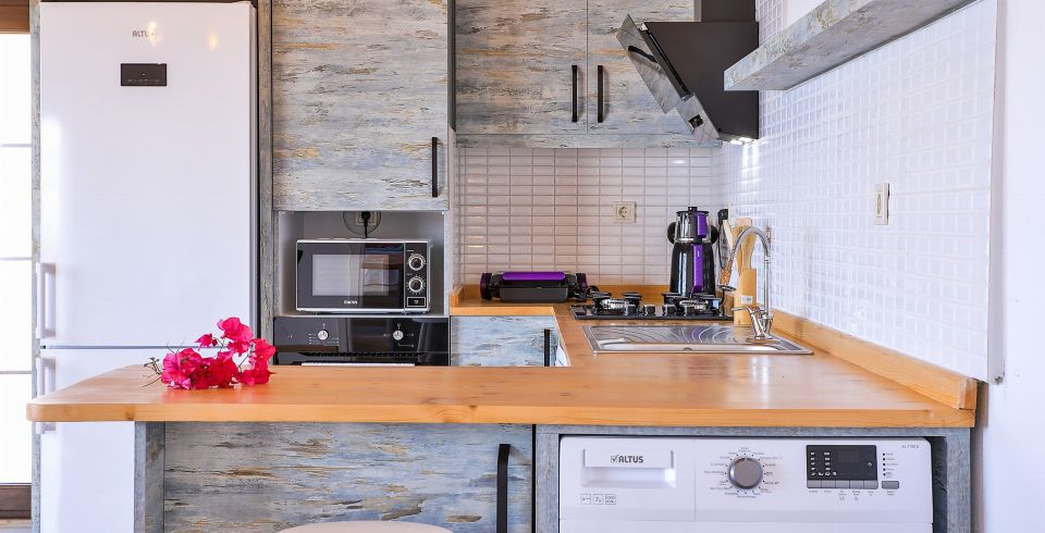 Mutfak : Villamızın geniş Amerikan mutfağı ile sizlere kendi evinizin mutfağı gibi hissettirecek. Ayrıca mutfakta klima, bulaşık makinası, buzdolabı, çamaşır makinası, mikrodalga fırın, tost makinası, ekmek kızartma, su ısıtıcısı, fırın, 4`lü ocak seti ve 3 kişilik geniş yemek masası ile tava tencere vb. mutfak araç gereçlerini kullanma fırsatını sizlere sunuyoruz.