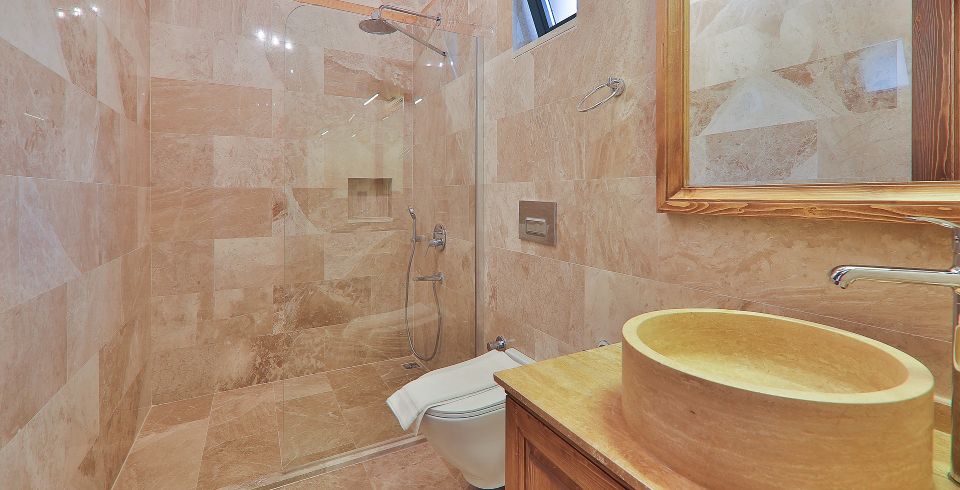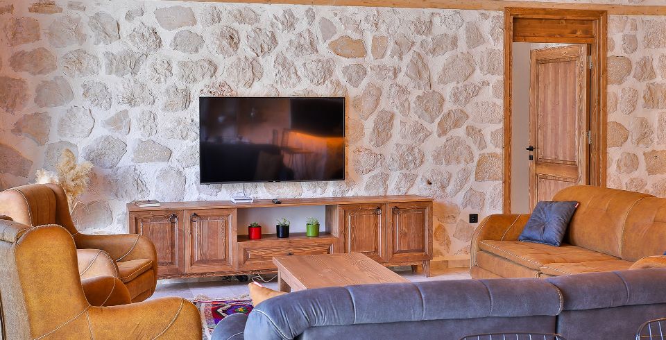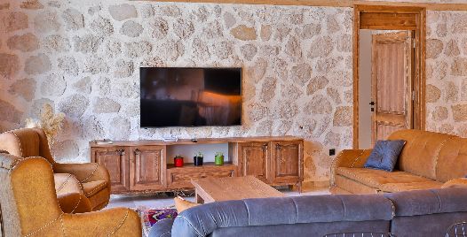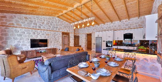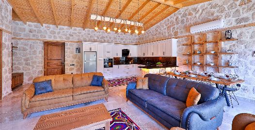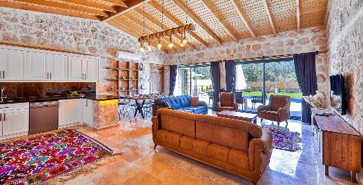 Salon : Villa korsan salonunda konforlu oturma grubu, klima, TV, internet, uydu alıcı, yemek masası, sehpa bulunmaktadır.