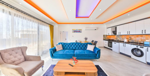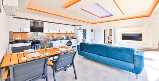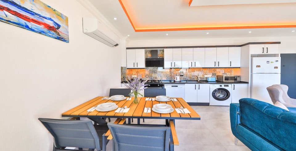 Mutfak : Buzdolabı, çamaşır makinesi, mikrodalga fırın, 4’lü ocak, fırın, tost makinesi, elektrikli su ısıtıcısı, çatal-bıçak takımı, tencere-tava takımı, bulaşık makinesi bulunmaktadır.