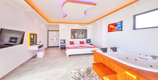 1. Yatak Odası : Çift kişilik yatak, Klima, komodin, elbise dolabı, TV, makyaj masası, banyo ve lavabo bulunmaktadır.