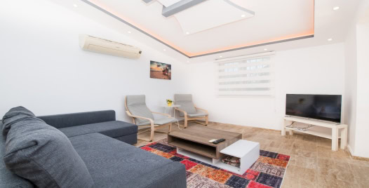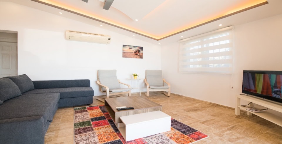 Salon: Özenle döşenmiş salon, modern koltuklar, 4 kişilik yemek masası, LCD TV ve klima bulunmaktadır.