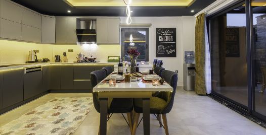 Mutfak : Amerikan mutfak içerisinde buzdolabı, bulaşık makinası, çamaşır makinası, yemek masası, mikrodalga fırın, 4’lü ocak, davlumbaz, fırın, elektrikli su ısıtıcı, yemek takımı, tava ve tencereler, çatal, bıçak takımı bulunmaktadır.