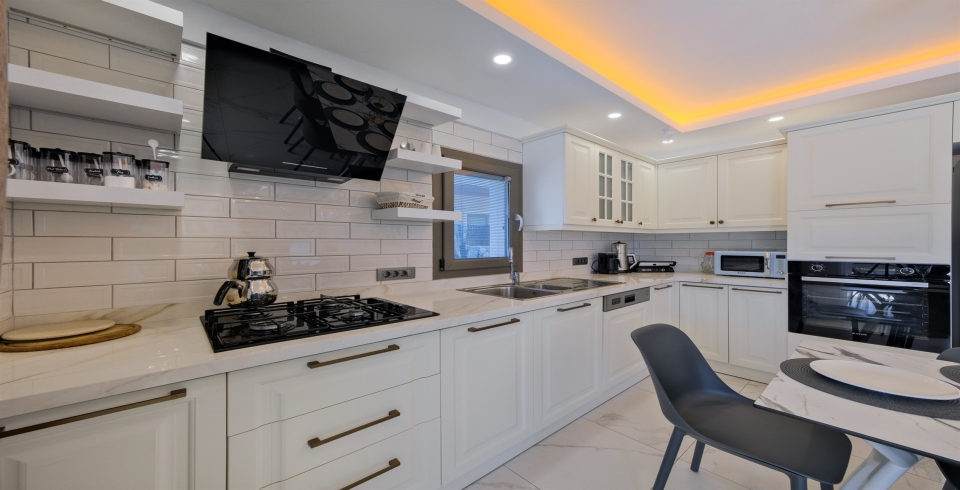 Mutfak : Modern Amerikan mutfak içerisinde yemek masası, buzdolabı, bulaşık makinası, fırın, ocak, mikrodalga fırın, tost makinası, kettle, yemek takımları, çatal ve bıçak takımları, tencere ve tava takımları, bardaklar bulunmaktadır.