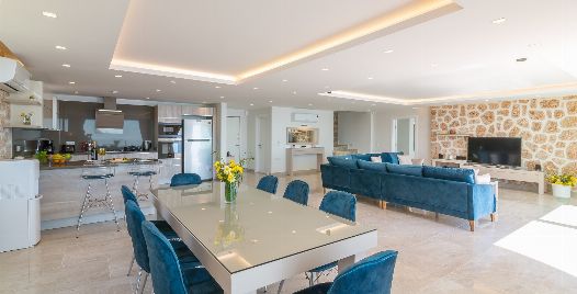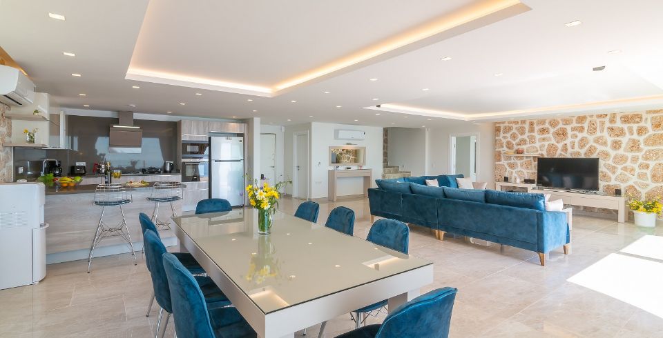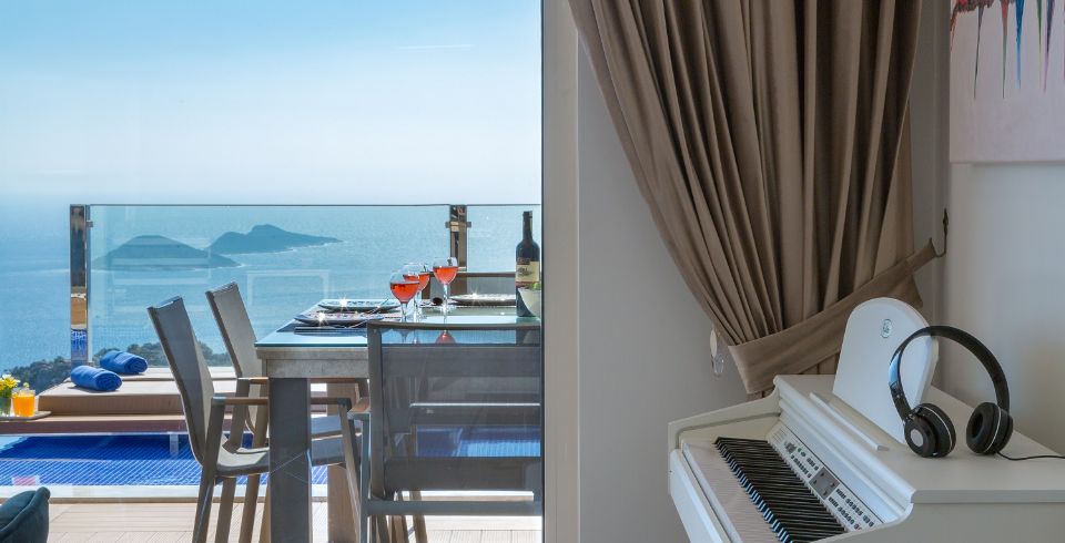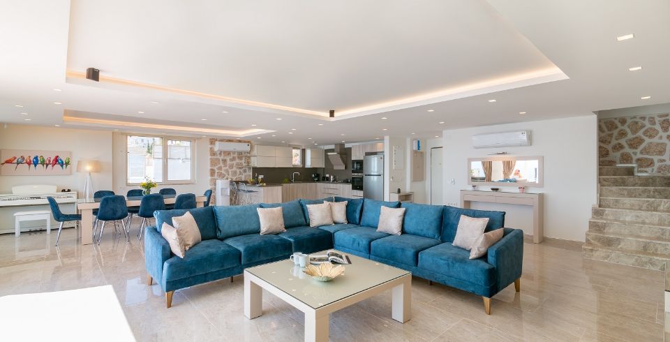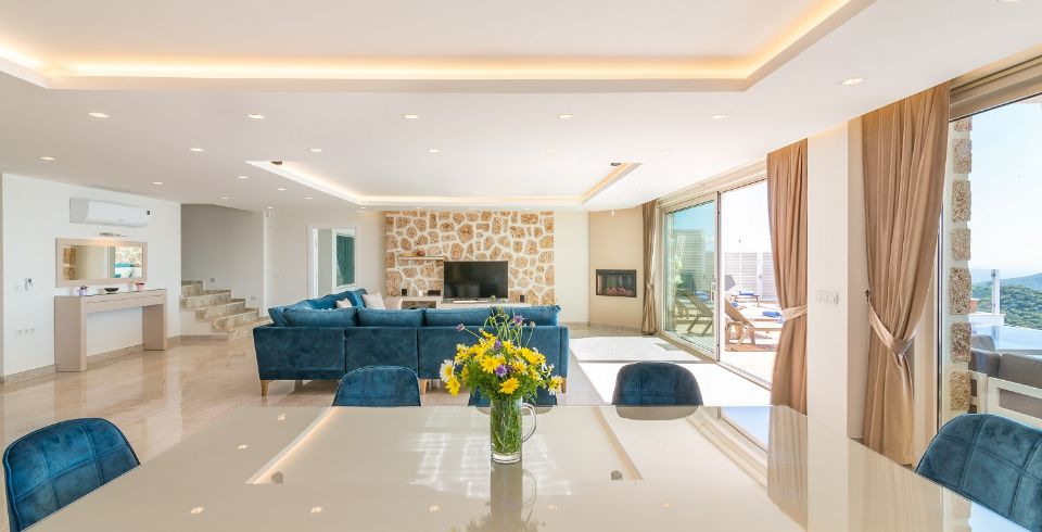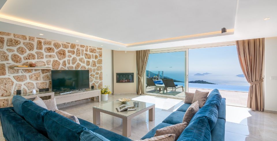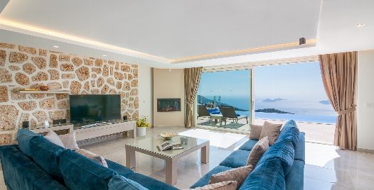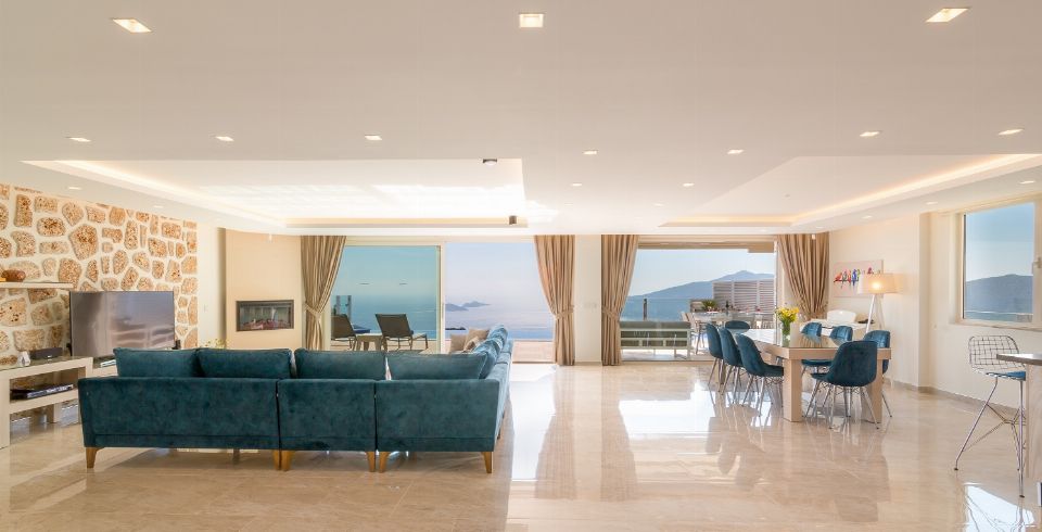 Villa La Mer Azur çok özenle dekore edilmiştir ve Kalkan koyu, Yılan ve Sıçan adaları manzarasına sahiptir. Yerden tavana kadar olan camları Villa’nın içerisinin ışıkla dolmasını ve muhteşem Kalkan manzarasının görülmesine olanak sağlar. Villamızda tüm ayrıntılar misafirlerin rahat ve huzurlu bir tatil geçirmesi ve konaklaması için düşünülmüştür. Villa’nın arkasında bulunan bahçede, yeşil alan içerisine kurulu 2 salıncak ve bir kaydırak kulesinden oluşan çocuk parkı mevcuttur. Ayrıca Salonda geniş oturma alanı ve İngilizce/Almanca/Rusça/Türkçe kanallar gösteren 55” Smart TV ve 5.1 Müzik Sistemi/DVD oynatıcı mevcuttur. Ayrıca elektrikli piyano ve şömine bulunur.
