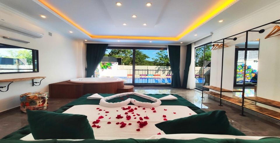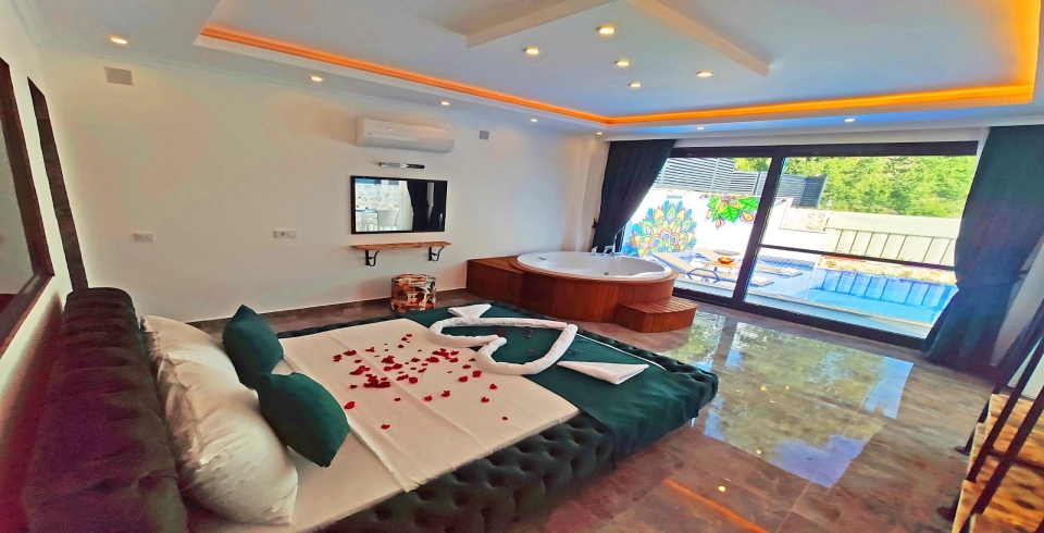 Yatak Odası : Çift kişilik yatak, komodin ,klima, makyaj masası, elbise dolabı, jakuzi, banyo ve tuvalet bulunmaktadır.