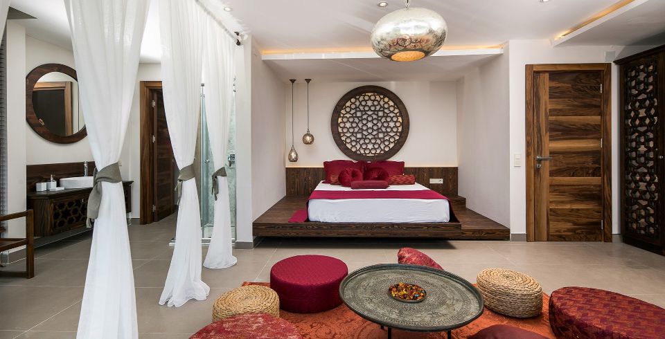 1. Yatak Odası : Süit yatak odası çift kişilik konfor yatak, klima, gardırop, komodin, LCD TV ve banyo-WC ve havuz terasına çıkış yer almaktadır.