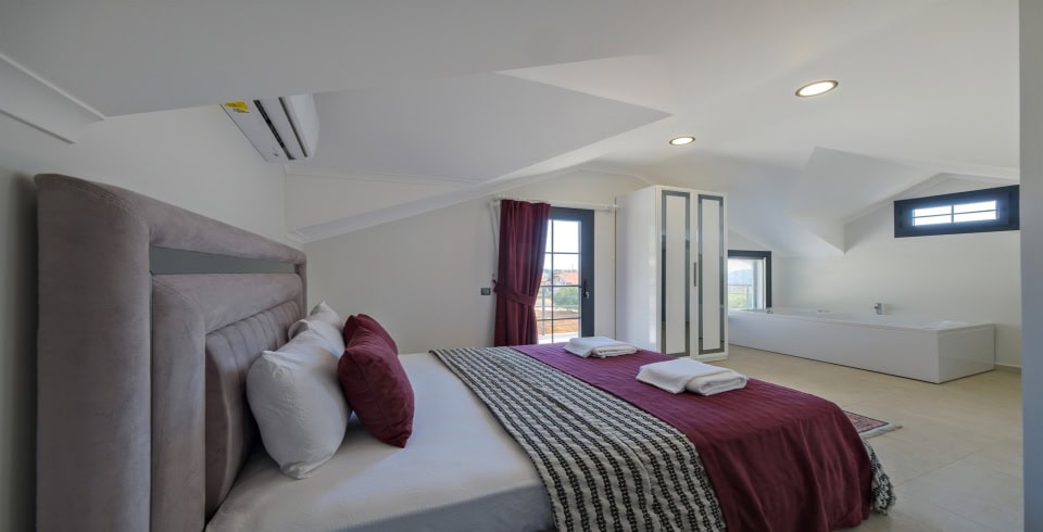 1. Yatak Odası : 1 adet çift kişilik yatak, klima,jakuzi, komodin, elbise dolabı, banyo ve tuvalet bulunmaktadır.