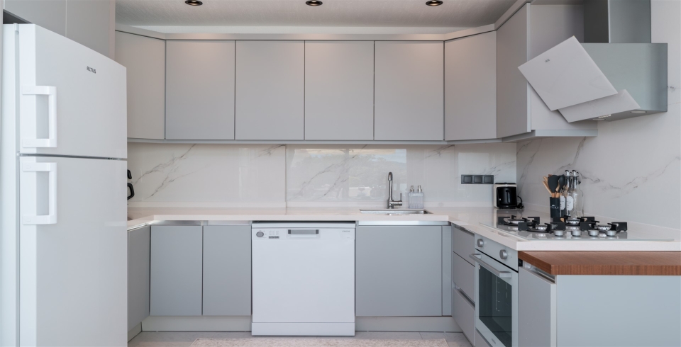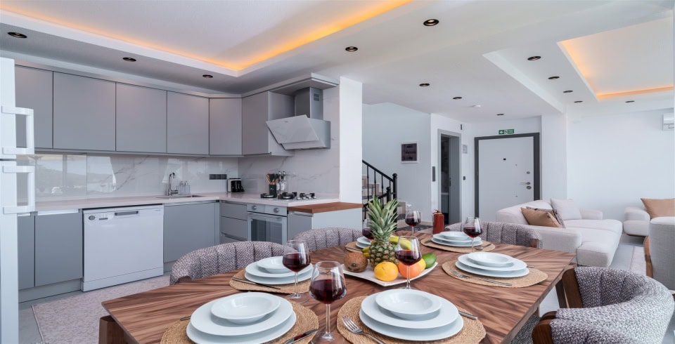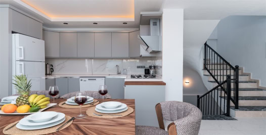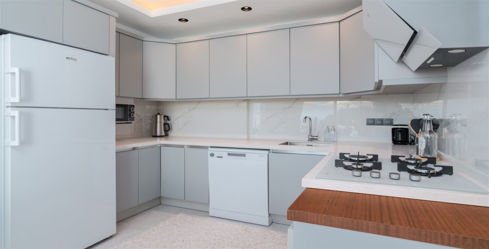 Mutfak : Amerikan açık mutfak ve salona sahip villamızın mutfağında buzdolabı, bulaşık makinası, ankastre ocak, fırın, mikrodalga, 4'lü ankastre ocak, kettle, çamaşır makinası, yemek masası ve temel mutfak araç ve gereçleri bulunmaktadır.