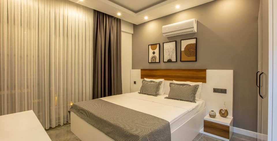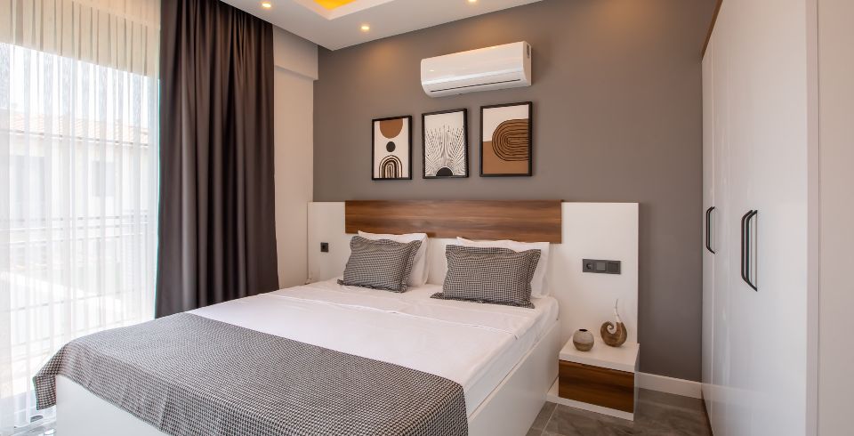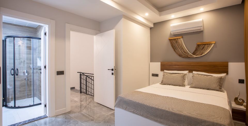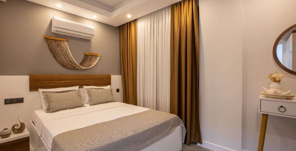 1. Yatak Odası : 1 adet çift kişilik yatak, klima, komodin, elbise dolabı, makyaj masası, banyo ve tuvalet bulunmaktadır.