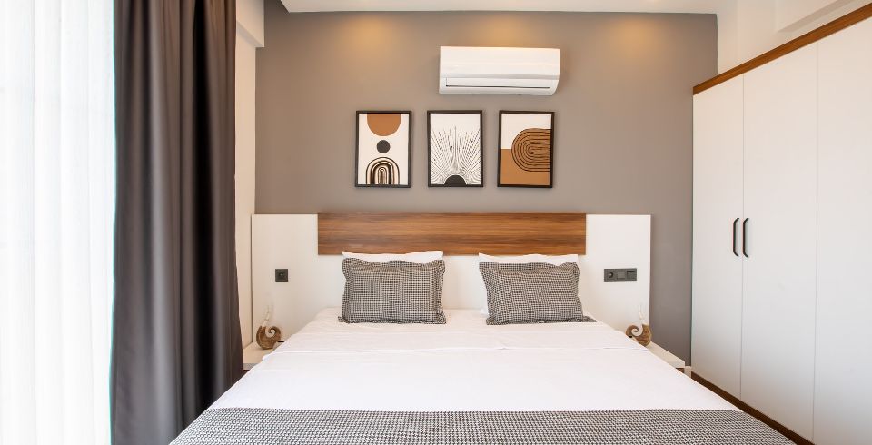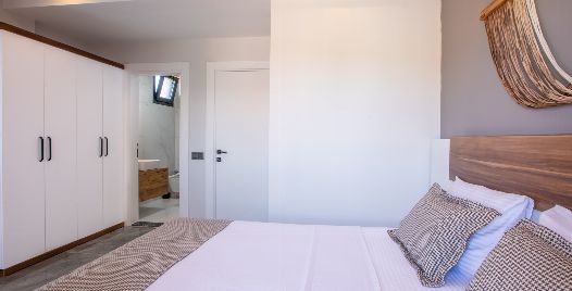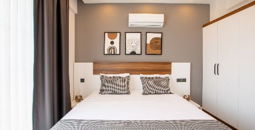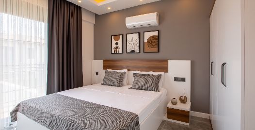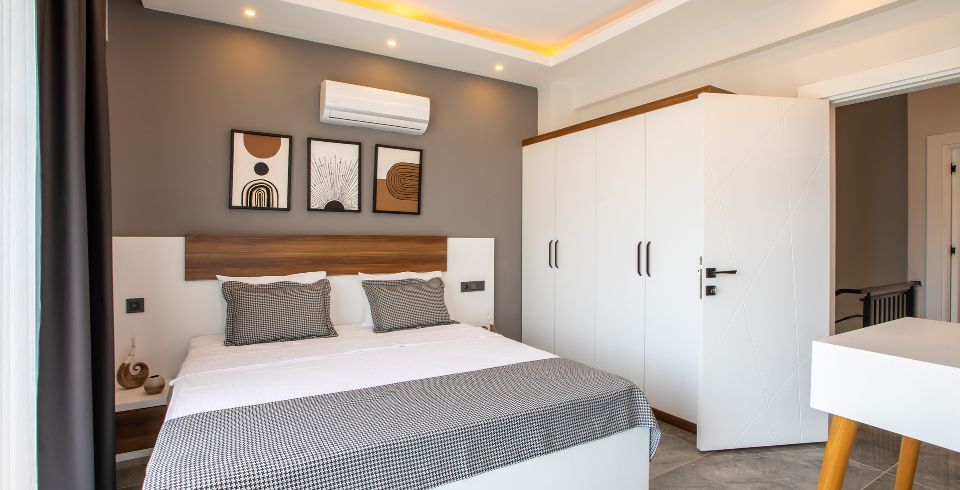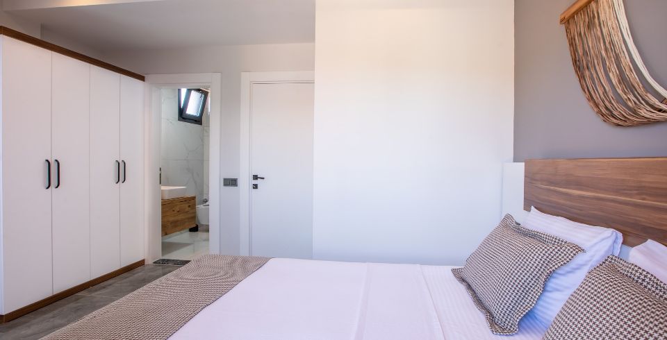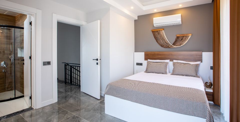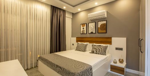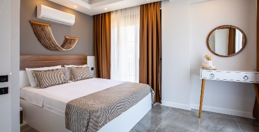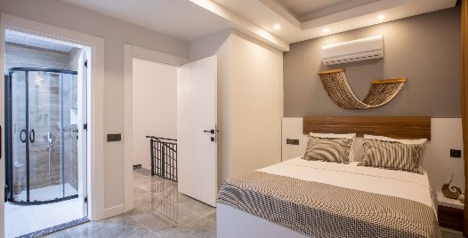 2. Yatak Odası : 1 adet çift kişilik yatak, klima, komodin, elbise dolabı, makyaj masası, ortak kullanım banyo ve tuvalet bulunmaktadır.