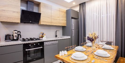 Mutfak : Modern Amerikan mutfak içerisinde buzdolabı, bulaşık makinası, fırın, ocak, çay Makinesi, mikrodalga fırın, tost makinası, yemek masası, yemek takımları, çatal ve bıçak takımları, tencere ve tava takımları, bardaklar bulunmaktadır.