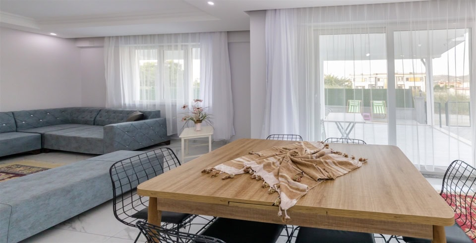 Salon : Salon içerisinde oturma grubu, TV, klima, sehpa bulunmaktadır. Havuz terasına çıkış yapılabilmektedir.