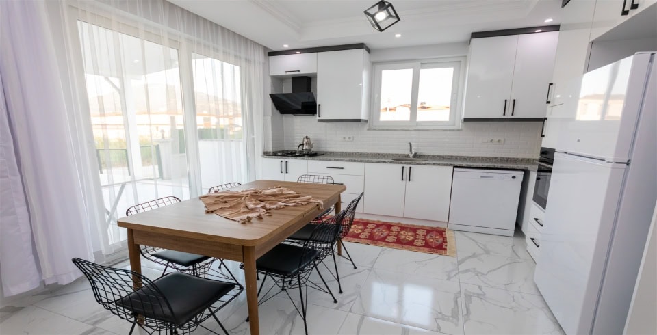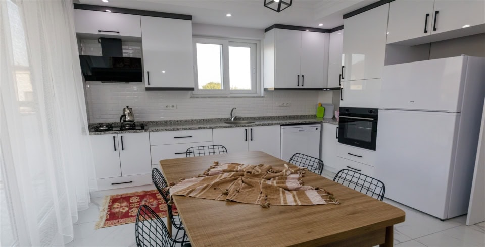 Mutfak : Yemek masası, buzdolabı, bulaşık makinası, fırın, ocak, mikrodalga fırın, yemek takımları, çatal ve bıçak takımları, tencere ve tava takımları, bardaklar bulunmaktadır.