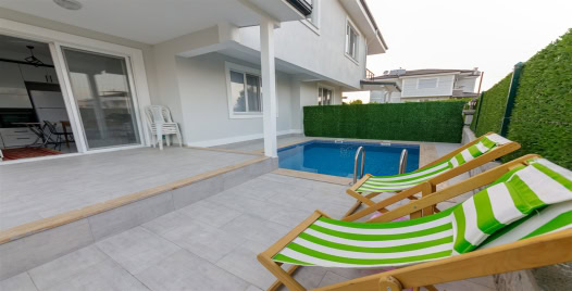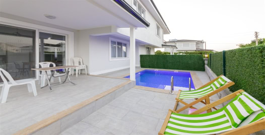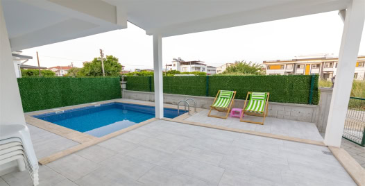 Bahçe : Bahçe içerisinde özel yüzme havuzu, 2 adet şezlong, küçük masa, taşınabilir barbekü bulunmaktadır.
