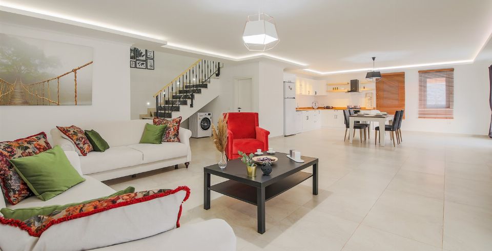 Villamız 2 yatak odası ve 4 kişilik konaklama kapasitesi ile çiftler ve çekirdek aileler için idealdir. Ahşap ve taş detayların modern dokunuşlarla harmanlandığı iç mekân, sıcak bir ambiyans sunar. Salon kısmında konforlu oturma grubu, televizyon, klima ve geniş cam kapılardan havuz terasına geçiş imkânı bulunur. Tam donanımlı Amerikan mutfakta; buzdolabı, bulaşık makinesi, çamaşır makinesi, fırın, ocak, kettle, tost makinesi, yemek takımı ve tüm mutfak gereçleri yer almaktadır.
