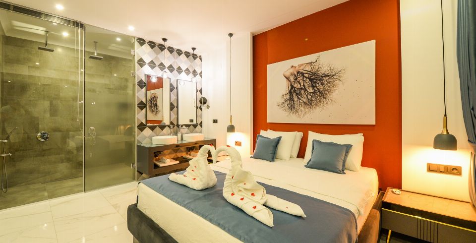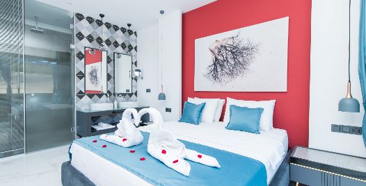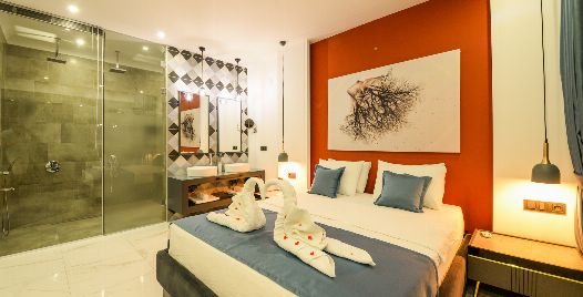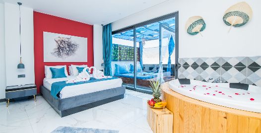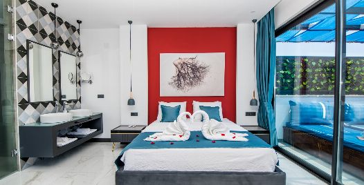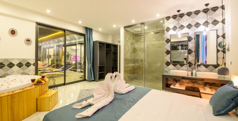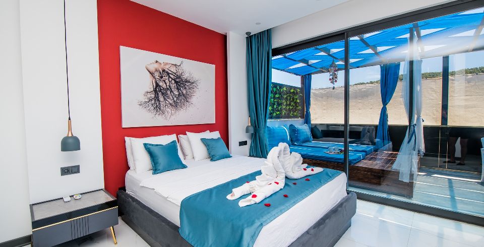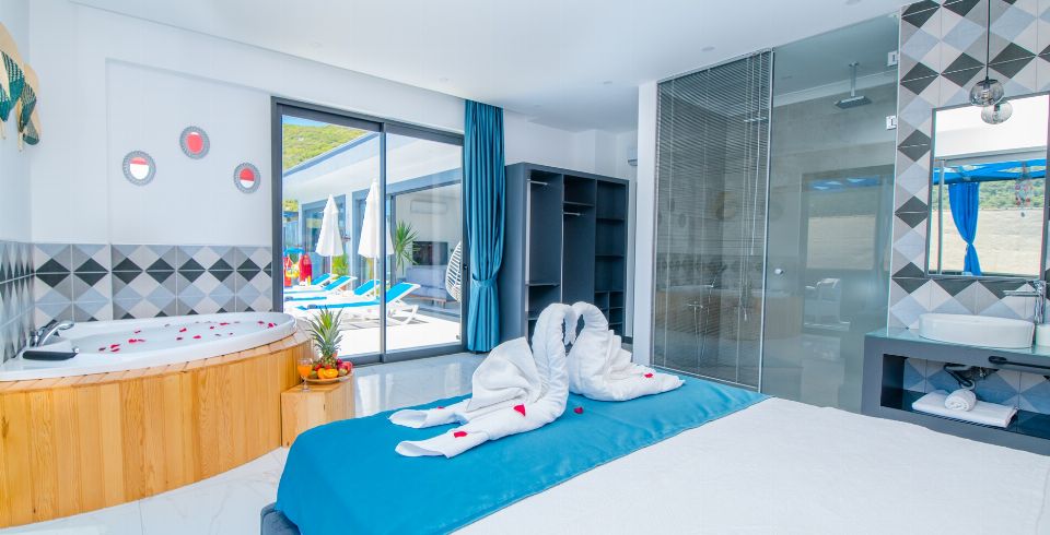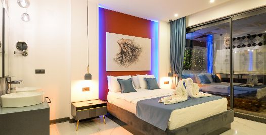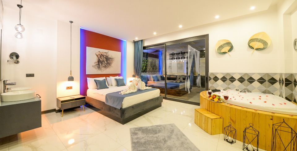1. Yatak Odası: 1 adet çift kişilik yatak, jakuzi, elbise dolabı, makyaj masası, komodin, klima ve banyo-wc bulunmaktadır.