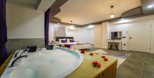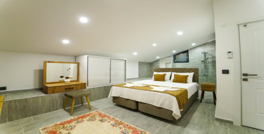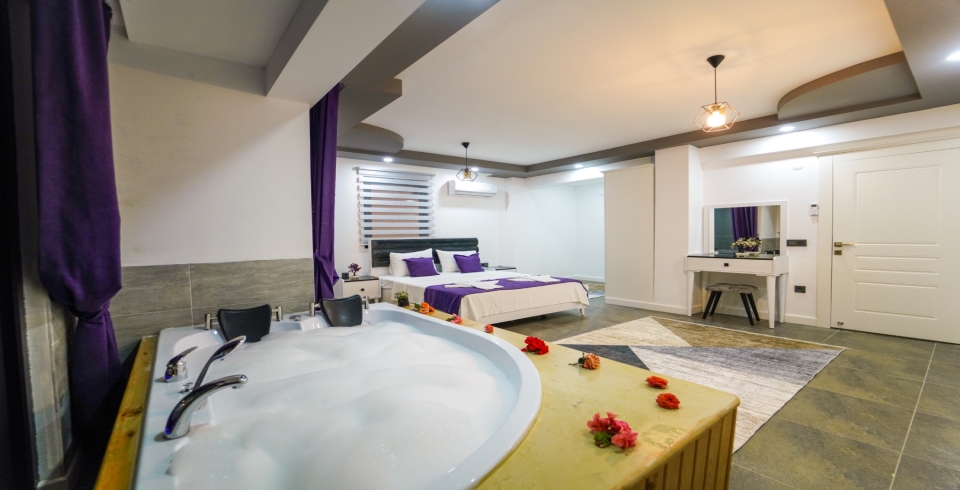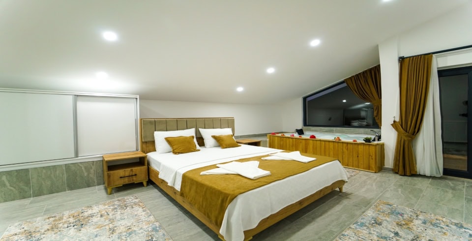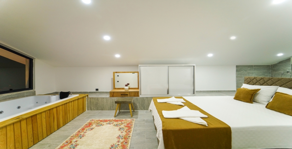 3. Yatak Odası: 1 adet çift kişilik yatak, komodin, elbise dolabı, klima, jakuzi, banyo ve tuvalet bulunmaktadır.