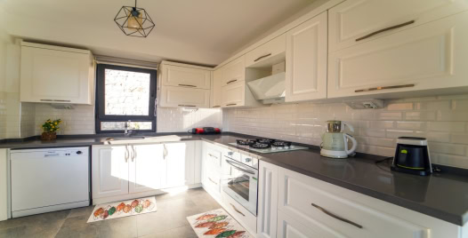 Mutfak : Villamızın mutfağında Amerikan mutfak yemek takımı, buzdolabı, 4'lü ocak, kettle , çatal bıçak takımı, tencere tava takımı, bulaşık makinası bulunmaktadır.