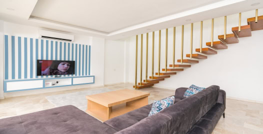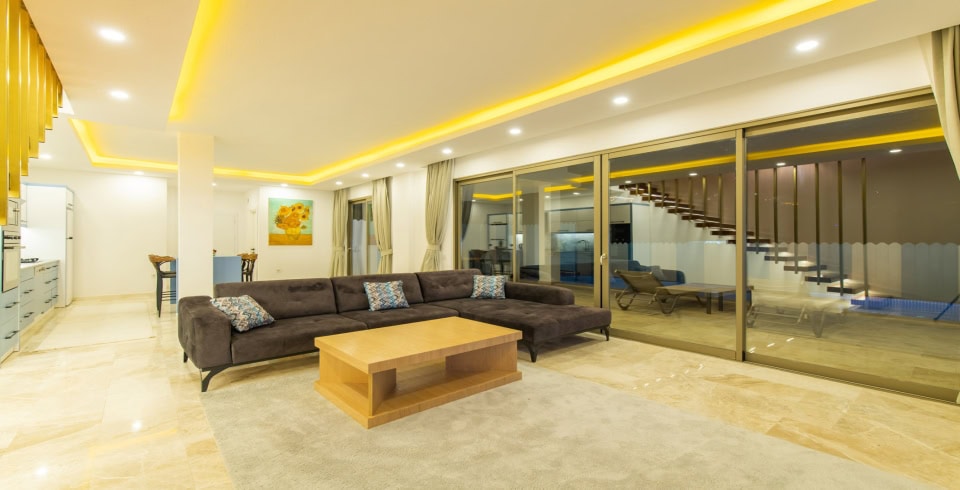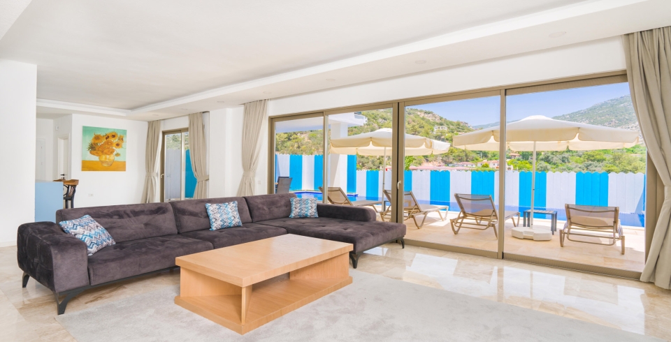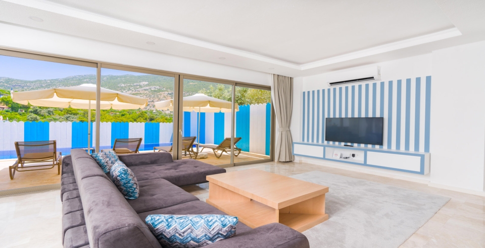 Salon: Villa salonunda konforlu oturma grubu, klima, TV, internet, uydu alıcı, yemek masası, sehpa bulunmaktadır.